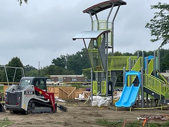 Assuming they get the project done before I retire (in 2028 or so), I can’t wait to go down the slide. It won’t be the maiden voyage down the slide. Some neighborhood kids will do that when they should be in bed with sugar plumbs dancing in their heads– that’s Christmas lingo, but, at the current rate, the playground construction may still be ongoing in December (making more fun of the slow progress. Sorry).