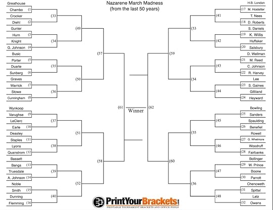 I was appointed as the selection committee of the Nazarene March Madness (OK… self appointed– by a three person committee— me, myself and I). It is totally, 100%, biased based on people I’ve known or respected. Your list of 64 will be different from mine. Cool.