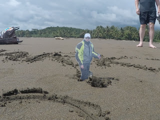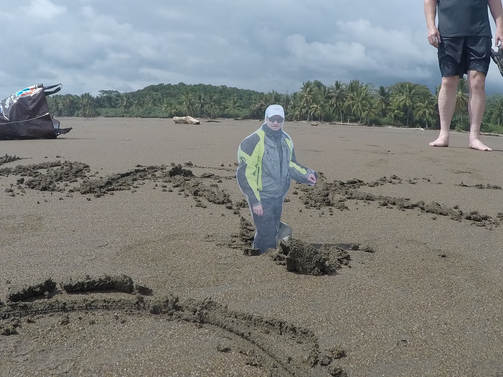 Markito Flaquito at the beachThe first night together in San José we discussed the schedule over dinner. The husbands would pick up the motorcycles and make their way through the mountains up to La Fortuna. The ladies would embark on their own adventure whitewater rafting on the Balsa River, and then we would meet at our hotel in the afternoon. In order to keep Mark involved in the fun, my wife, Britt, suggested that we fashion a photo of Mark after Flat Stanley and take pictures of him during the trip. We affectionately dubbed our traveling companion “Markito Flaquito” (little skinny Mark) and our adventure began.