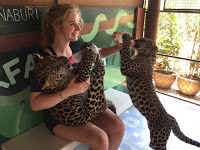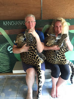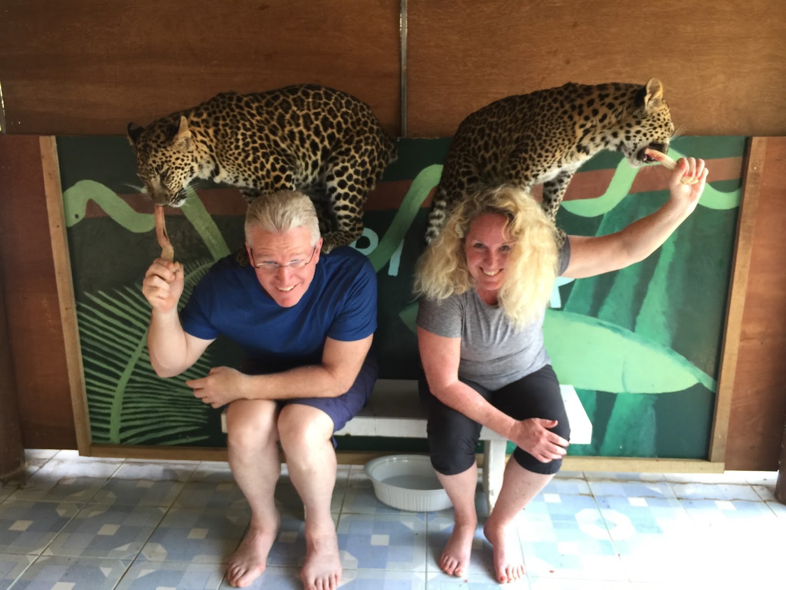 After a good night’s rest, we embarked on the first thrilling quest—feeding tigers and riding elephants. Growing up on a farm you develop a healthy respect for large animals. You learn that no matter how loyal or docile, large animals have the propensity to injure or kill you at any time. In spite of that learned respect, I found myself bottle-feeding juvenile leopards in a cage. They tugged at the bottle like baby calves I used to feed, but I couldn’t help but wonder what would happen when the bottle was empty. Of course, I found out. I fed them raw meat at the end of a rawhide bone while they sat on my lap. I was relieved to emerge from the cage with all my fingers.