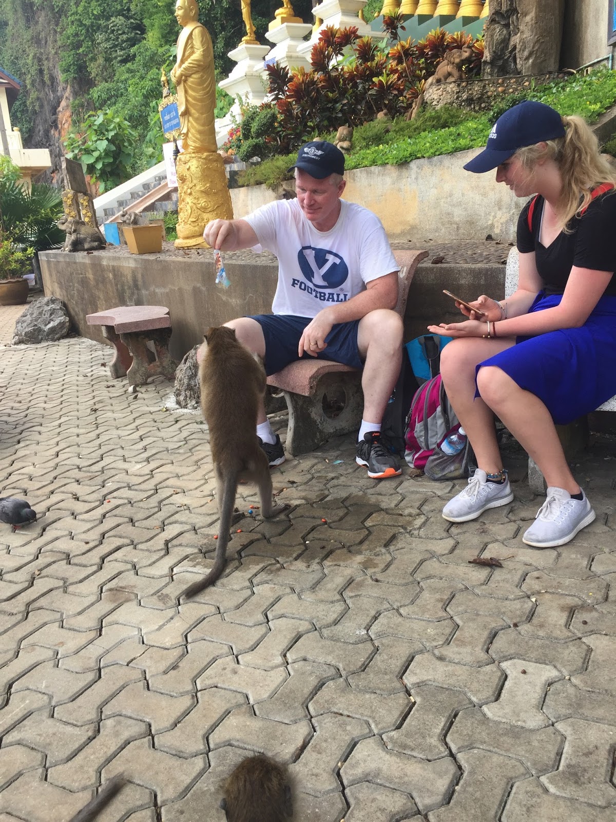 Monkeys at Tiger Cave TempleIt was foggy and cooler the next morning, but that was perfect weather for the next adventure—climbing 1237 uneven and steep steps to a Buddhist temple atop a limestone mountain. Tiger Cave Temple overlooks Krabi from the North and boasts incredible views of the surrounding geography, but you will pay a price for those views. My daughter wanted to race to the top, so we split off from the rest of the group and kept a grueling pace. We stopped for photos and to catch our breath, but made it to the top in about forty minutes covered in sweat. The breathtaking vistas made the climb worthwhile. I sat and took it all in as everyone else climbed to the top. As I sat enjoying the view, I met people from the Philippines, Malaysia, Germany, France, Canada, and Spain. I guess the desire to climb is universal and the risk was certainly worth the reward.