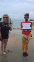 Britt with NattyWe thought we booked a private boattour across the Straits of Malacca to Phi Phi Island, but soon realized as our flatbed truck-cum-taxi filled up with people, that we were part of a bigger tour. After some heated and somewhat confusing negotiations, we cut the price in half for the tour and were assigned to Boat 21 and lined up on the beach to load up. Our guide, Natty, burst on the scene with great fanfare dressed like a banana with shorts on. His flamboyant delivery of instructions and coquetry kept us entertained as we island hopped our way to Phi Phi Island.