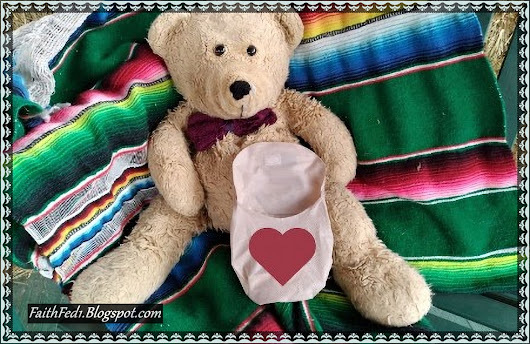 My 20-year-old teddy bear, "Hugs", sporting one of my ostomy pouches. (He's such a cutie!) When I first discovered other ostomates (people with ostomies (aka