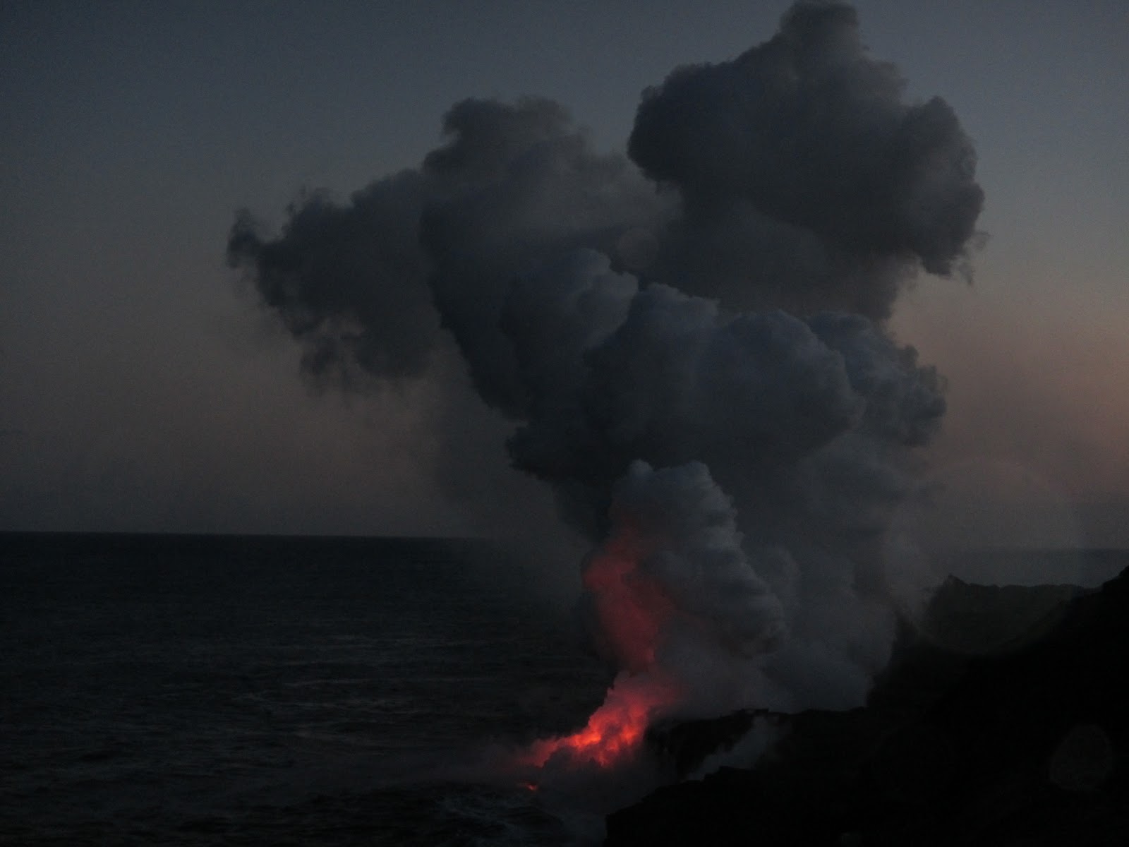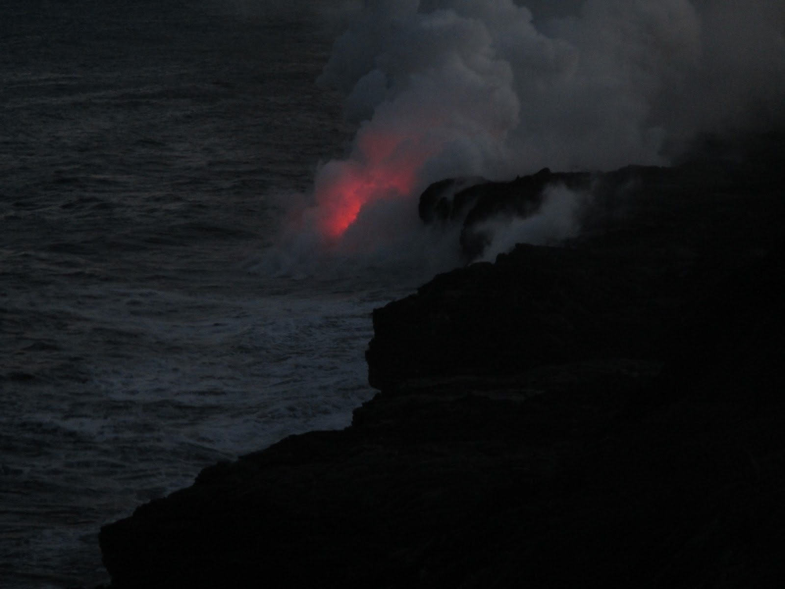Challenging hiking aside, we finally reached the place where the active lava flows into the ocean (and as you approach it, the air gets hotter and hotter - it's kind of scary). Here are a few pictures as the sun sets.