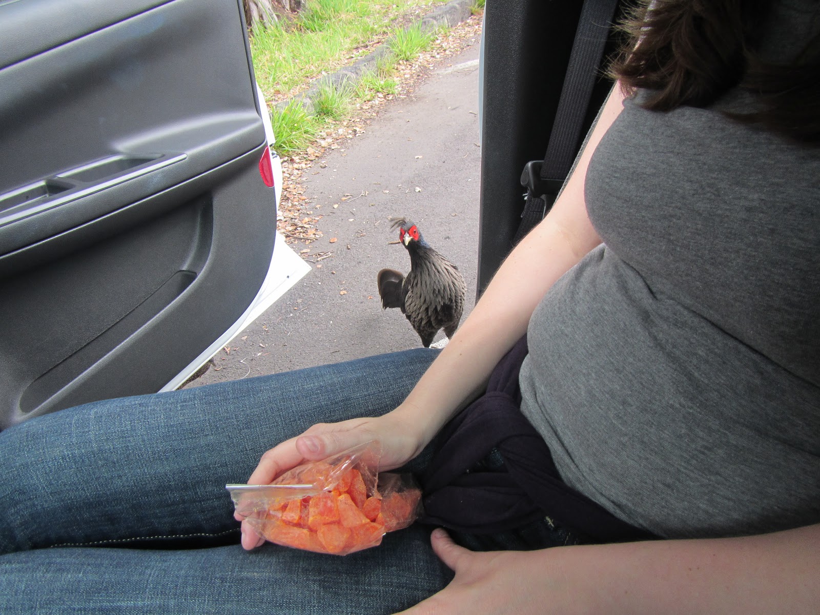 This pheasant (and his unseen mate) were circling around the parking lot like vultures trying to nab treats from tourists. This one is pretty much saying 'hello there' and seeing if Rachael will give up a papaya treat. Unfortunately, there is a sign that says that we shouldn't feed them.