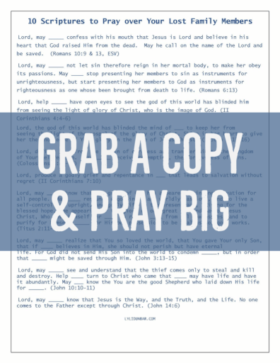 When we pray, we need to pray expectantly. Picture how life will look differently once God’s redemption wins the day in the life of your lost loved ones. God has big plans for your family, and you can look forward in faith and imagine what your miracle will look like.