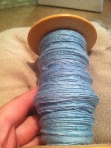 I haven't spun yarn in a while; no, not story telling, but actual yarn creating for knitting or crocheting. I had a batch of wool from last winter that I had dyed blue but not spun yet, so I finished it today. I just did a pretty simple, small twist art yarn since i don't plan to ply it, but will leave it as a single ply. Now I need to get some more wool!