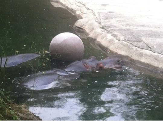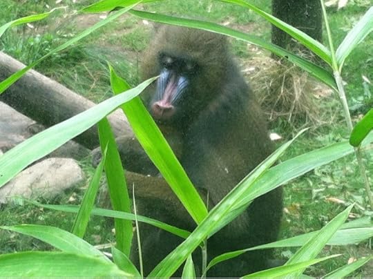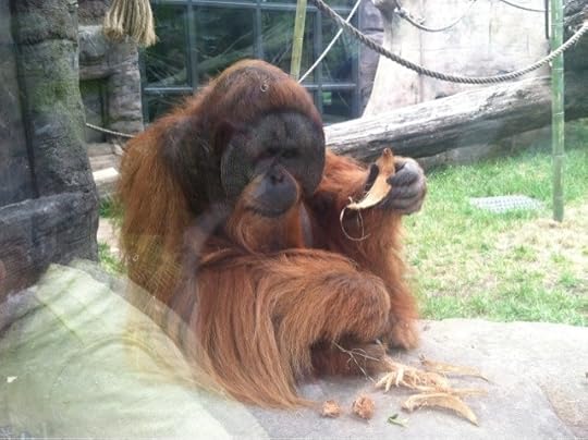 This orangutan was chewing off bits of coconut husk, and rolling them into balls in his mouth. He would then spit the coconut husk balls into one hand and repeat. When he laid eyes on Madyson, he started spitting his coconut husk balls out so they would roll in front of her. I think maybe he wanted her to pick them up but the bullet proof glass prevented their friendship from developing further.