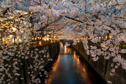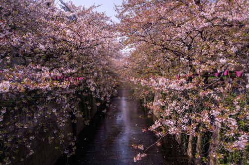 nubbsgalore:cherry blossoms over tokyo’s meguro river and...