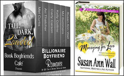 Susan is giving away a copy of Tall, Dark, & Loaded, the Billionaire Boyfriends box set in which Marrying for Love was originally published with five other novellas. To enter the drawing, complete the form linked here. If you are in the U.S., she’ll also send a signed copy of Marrying for Love.