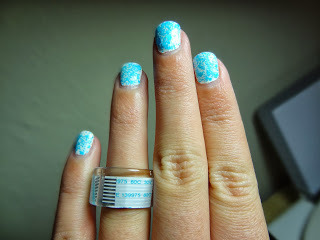 My Clan-themed nails (white nail polish with an overcoat of blue hexagons):