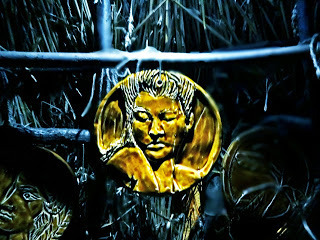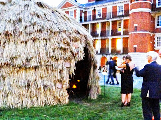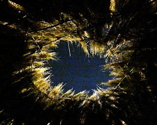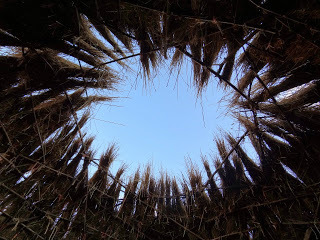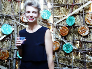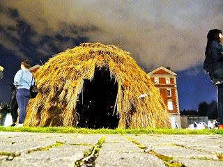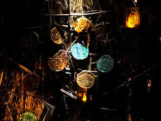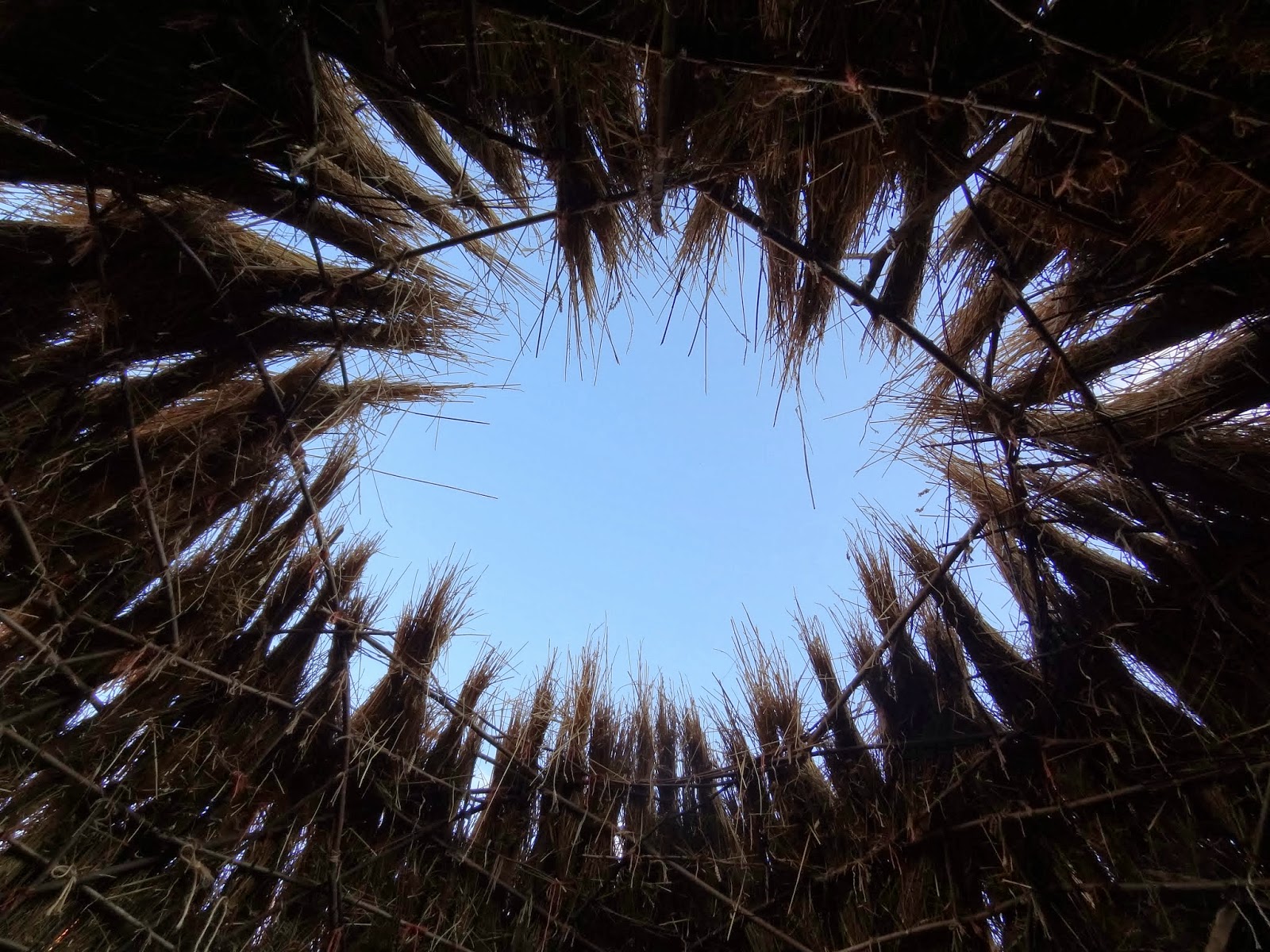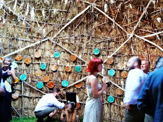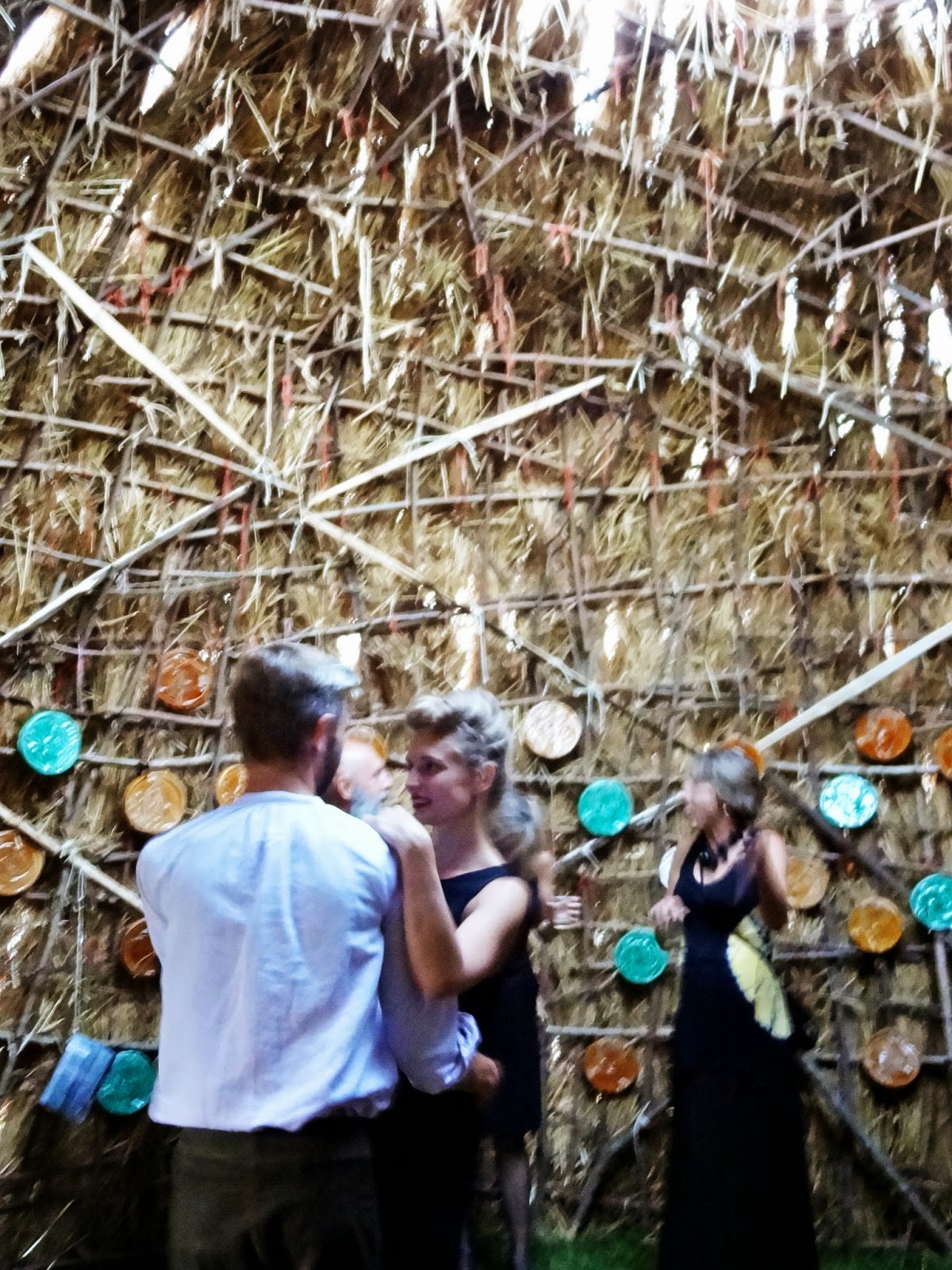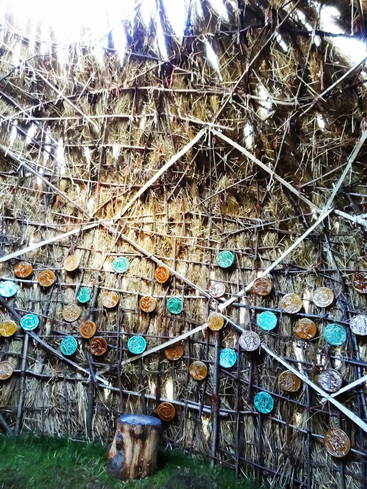 When you walk in, you'll see tons of earthenware ornaments (handmade by Necole) hung up in the room, all representing different aspects of Necole's memories. Above, there is a skylight. Necole built the entire structure, gathering hay and wood from the English countryside.