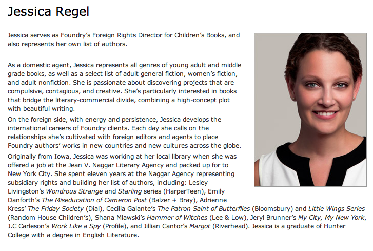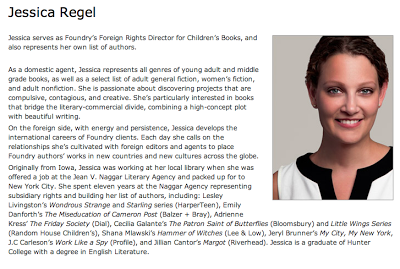 It's been a while since I interviewed literary agents. I am happy to report that today I am featuring my super agent Jessica Regel! Jessica is a literary agent at Foundry Literary + Media--an amazing agency full of talented agents such as herself. Jessica represents many stellar clients such as Emily Danforth, Adrienne Kress, and Lesley Livingston. She is a thorough enthusiastic, and hardworking agent: She works with the author on revising, planning, and putting together a powerful submission list. She is proactive, communicative, honest, and professional. If you're an author on a search for an agent, I highly recommend putting Jessica on your query list.