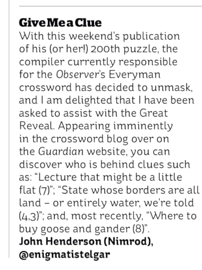 I collaborated with Allan Scott, Colin Gumbrell and – via the archives – the other three setters of the Everyman crossword since 1945 (Alec Robins, Dorothy Taylor and of course Derrick Somerset Macnutt) on an anniversary puzzle.