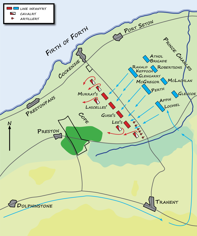 The Battle of Prestonpans was fought on 21 September 1745. It was one of the most dramatic battles ever to be fought on British soil. By any objective measure, the result should have been an easy victory for the government forces, but by skill, courage and some luck the forces of Bonnie Prince Charlie swept all before them. This was a triumph for the Jacobites and a crushing blow to the hopes of the government that the rising would be put down quickly. The followers of Bonnie Prince Charlie were called "Jacobites" as they supported the claim of his father James to be King of Britain, "Jacobus" being Latin for "James".