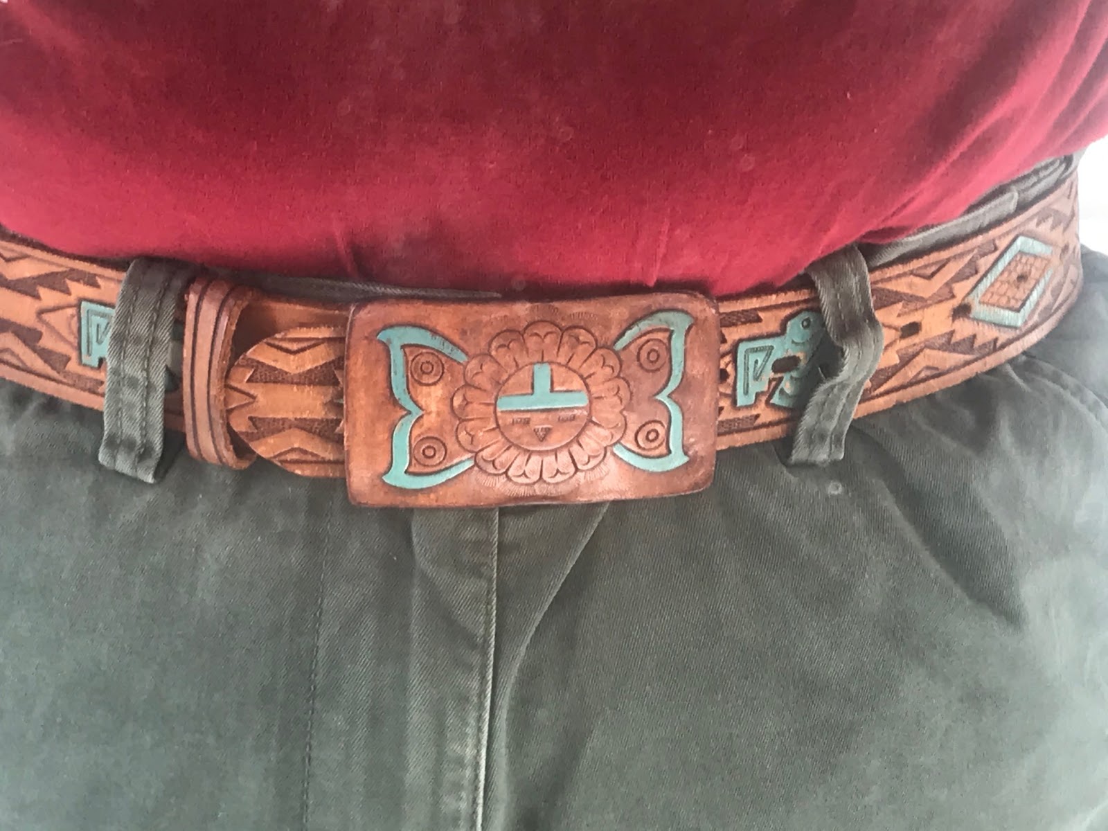 We'll start with this one. It is the only one that I can get to do up on me, so I'm modelling this one for you. On the back my father has written "Albuquerque 1970". My father did a lot of business out in the USA. Sometimes when he went he would add a week or two to the trip to do some sightseeing. I remember a few bits and pieces. For instance I recall that this belt came from some Navajo craft store that he visited. I remember it because he bought me a wallet with the same sort of embossed and painted decoration on it. It was the first grown-up wallet I ever had, and I used it until it fell to pieces, so it was good to rediscover this belt.