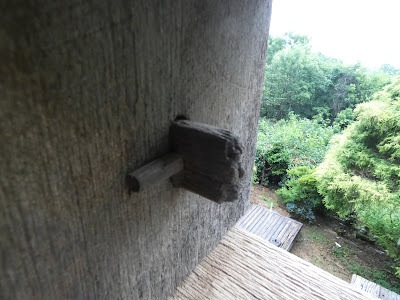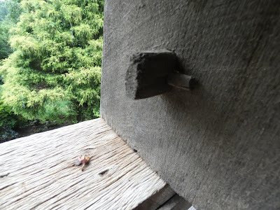 John cut a window in the eastern end of the barn and built a little shelf/table under it to give us a place to eat. This bench was made of an oak plank that was lying around the barn. John removed the nails that were in it and hammered them straight for reuse.