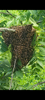 I was thrilled when John told me he'd spotted a swarm of honeybees at the edge of one of our fields. We've often seen them browsing on clover but this is the first swarm we've noticed. Thanks to Justin for the pictures! (I have no idea if the video will play.)