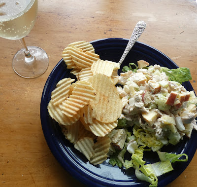 Hot weather like we're having requires cold meals. I've done cold potato soup and gazpacho and last night was chicken salad. (And potato chips--a traditional accompaniment and rare indulgence.)