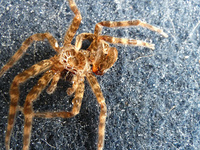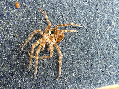 Early morning and I found what appeared to be a paralyzed or dead spider on the mat by the door out to the deck. And there on the door above me was the biggest Wolf Spider I've ever seen--the size of my hand with fingers outstretched.