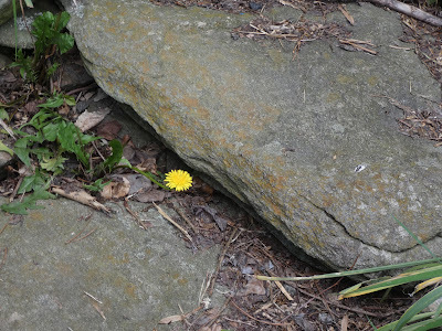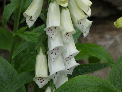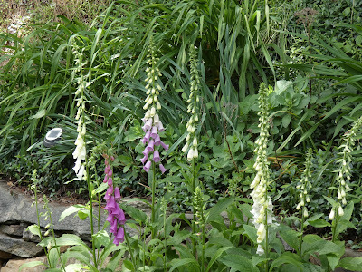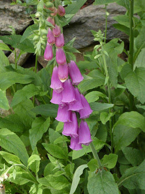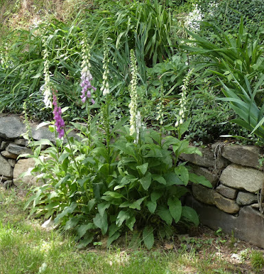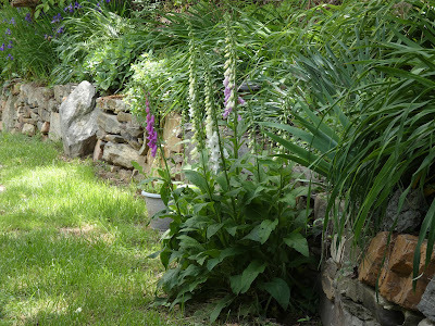 My gardening is sadly limited these days, what with a bad back, wonky knees, and perilous balance. And our entryway is already thick with iris, day lilies, and other perennials. But I really wanted a patch of foxgloves. So last summer I made a little bed for them by simply dumping a bag of potting soil in front of the rock wall , surrounding it with rocks, and sprinkling foxglove seeds over it.