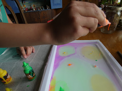 You mix up some powder with water and when it is ready (a day later) you pour it in this tray and drop paint on it. The paint floats on top!