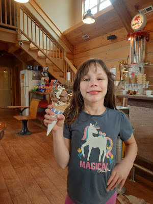 This was an extra-good cone with the two flavors in four layers. And sprinkles in between. Cynthia is really nice.