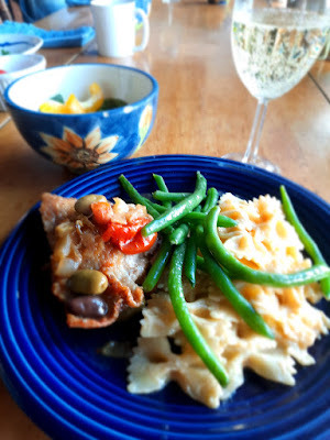 1/2 cup mixed olives plus 1/4 cup olive brine (the original recipe specified Castelvetrano olives but not having those, I used some fancy mixed olives we'd been given for Christmas.)