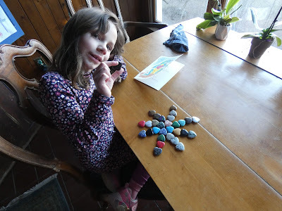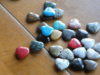Then when we got home, there was a Valentine card with a dragon on it for me and a bag of hearts made our of different colored stones--like a dragon's hoard. My favorite is the blue one that might be lapis lazuli. I made all sorts of shapes with them.