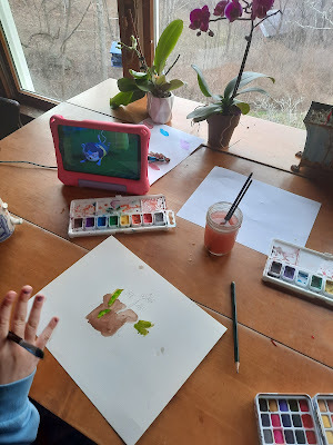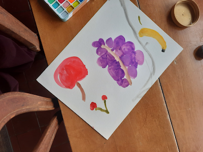 These are pictures I painted on Monday. I remembered to leave a little bit of white on the apple like Meema told me a long time ago. Then I decided to paint a picture of one of the orchids on the table.