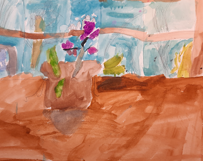 First I did the little brown pot, then the leaves and flowers, and then the table and the window and the outside. Meema said she was really proud of me because drawing what you see is harder than drawing an idea. I like my picture. You can see the yellow bush that is outside and a tree.