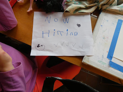 Then I decided the cords on the roll-up shades in the dining room would be perfect zip lines for the Castle People and made a sign NOW HIRING to get Meema and Grumpy to be lifeguards for the zip lines.