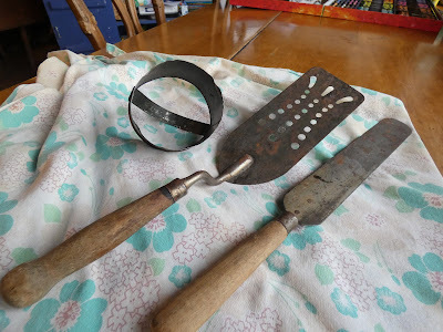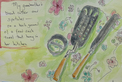 Next up, my grandmother's biscuit cutter and spatulas. I don't use these--but can't get rid of them. Maybe painting them will allow me to let go.