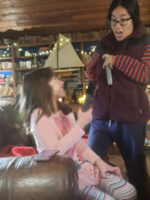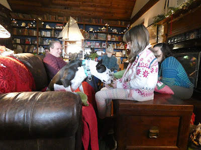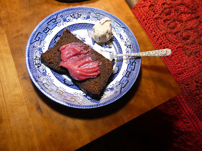 An excellent dessert, leftover from the Christmas feast. A moist gingerbread cake topped with a cranberry coulis and accompanied by homemade cinnamon ice cream--all the work of my DIL Aileen.