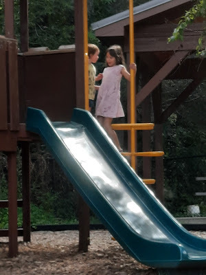 There are almost always kids to play with at the library. There was a girl that I knew from preschool and some others. We ran all over the playground and swung on the monkey bars.