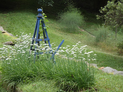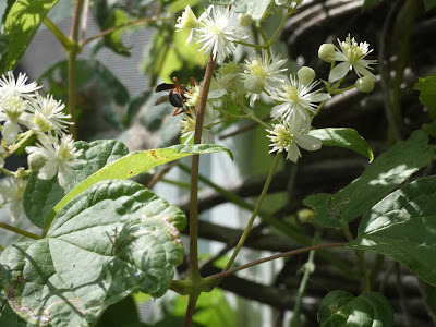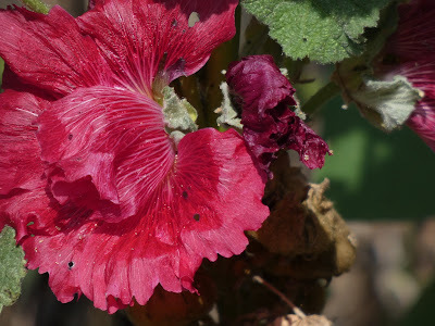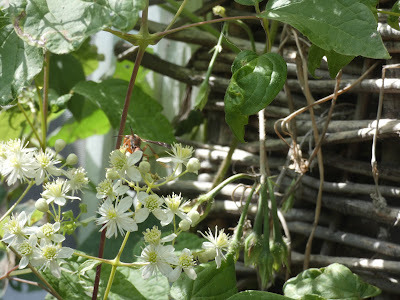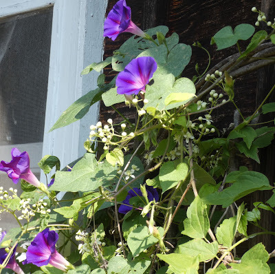 Oh, so welcome volunteers--morning glory, autumn clematis (maiden's bower), and hollyhocks.
