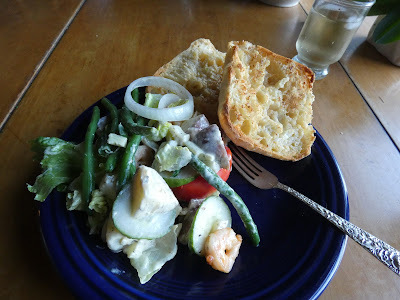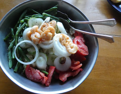 A bed of Romaine lettuce, the potato salad, tomato wedges, sliced cucumber, ditto onion, leftover cooked green beans, a little salt, a drizzle of olive oil and white balsamic vinegar and the fancy touch of a handful of shrimp, sauteed in a little butter and Sriracha sauce came together to make this not-quite Salade Nicoise.