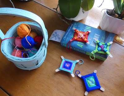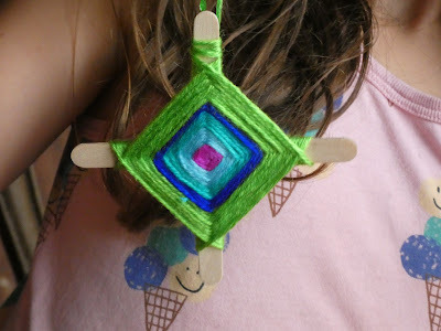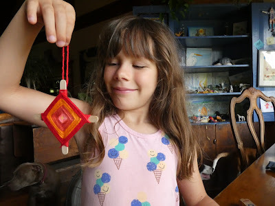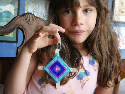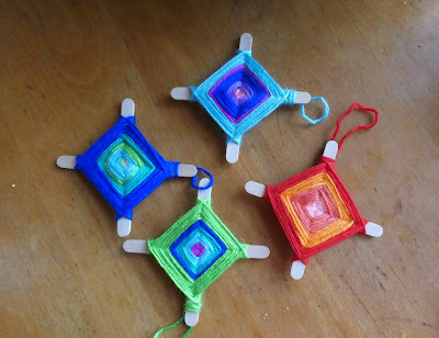 Meema and I made God's Eyes on Monday. They are also called Ojos de Dios in Spanish. I am learning a little Spanish. This first one is for me with all my favorite colors. I picked out the colors and said which one went where. Meema did the winding and knot tying. She said the yarn was slippery and might be frustrating for me. She said it was frustrating for her.