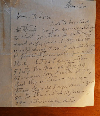 Just a few lines to thank you for your invitation to visit you. There is nothing I would enjoy more if my health would admit. I know I would have a pleasant time with you and Ruby but as I grow older I feel the need of staying at home. My health is very bad this winter-----Now these records I am sending are to the best of my memory. I do not remember dates. Now if this is not satisfactory please let me know & excuse all errors.