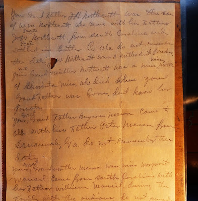 Your grandfather J.H. Northcutt was the son of W.M. Northcutt who came with his father J.W. Northcutt from South Carolina and settled in Butler Co., Ala. Do not remember the date. J.W. Northcutt was a Methodist preacher. Your great grandmother Northcutt was a Miss Nancy Morrz (?) of Ahoobuta, Miss. who died when your grandfather was born. Don't know her parents.