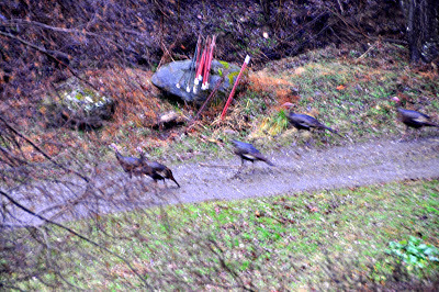 The turkeys are back -- about fourteen of them. I saw them promenading down the road and hurried out to the porch to get a picture. As soon as they saw me, they picked up the pace and were soon out of sight.