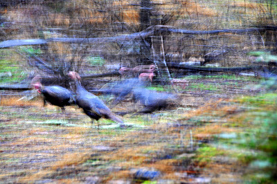 I ran for the camera again. The poor turkeys were panicked at all the barking and between the rain and the dim light and my hurry, the pictures came out very odd indeed. But I thought that first one had a real impressionistic feel to it as well as a nice composition of straight and curving lines.