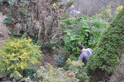 I love these plants but they have been blocking our view for too long. Our good friend, Doc Adams, got the ball rolling by volunteering himself for a spot of chainsawing. John and Justin assembled the implements of destruction and the guys went at it while I stood around pointing at things I thought needed cutting back.