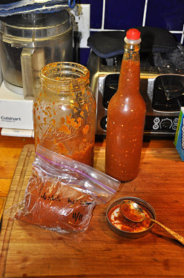 Justin made about three gallons of this wonderful stuff and he brought us a half gallon. We decanted some into a soy sauce bottle, saved for the purpose. This will be kept in the refrigerator. The rest I put into zip bags to freeze for later use.The flavor is smoky and intensely peppery and it is Hot. I like it in scrambled eggs, with ramen, and about anywhere I might use hot sauce. I'm tempted to add it to the Thanksgiving gravy . . .