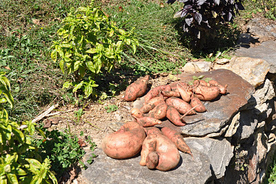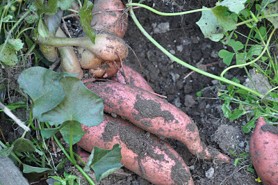 Sweet potatoes curing in the sun to toughen their skins for storage . . .There are more to dig . . .