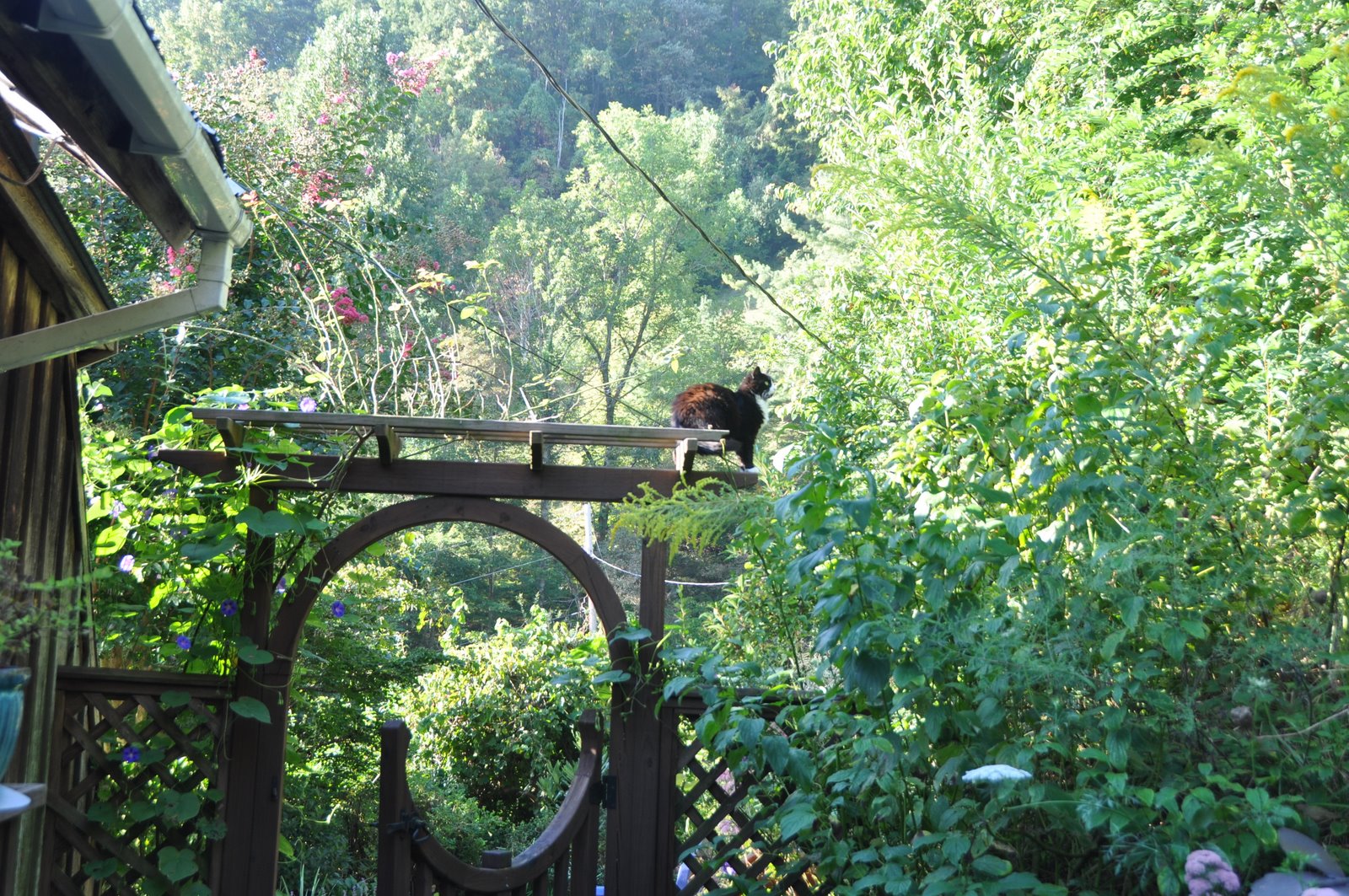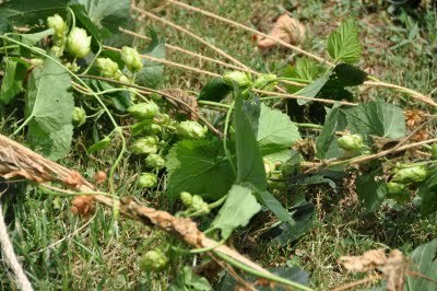 Those are hop vines growing up the side of our barn. Hops are the little cone-like flowers produced by the female plants and they have been a traditional flavoring in beer since the eleventh century.Nearby Asheville has become known for its micro-breweries and now some area farmers are growing hops to supply them.. Our friend Cory is a micro-micro- micro-brewer -- aka a home brewer -- and he thought he'd like to try his hand at growing his own hops.