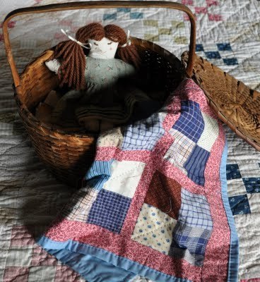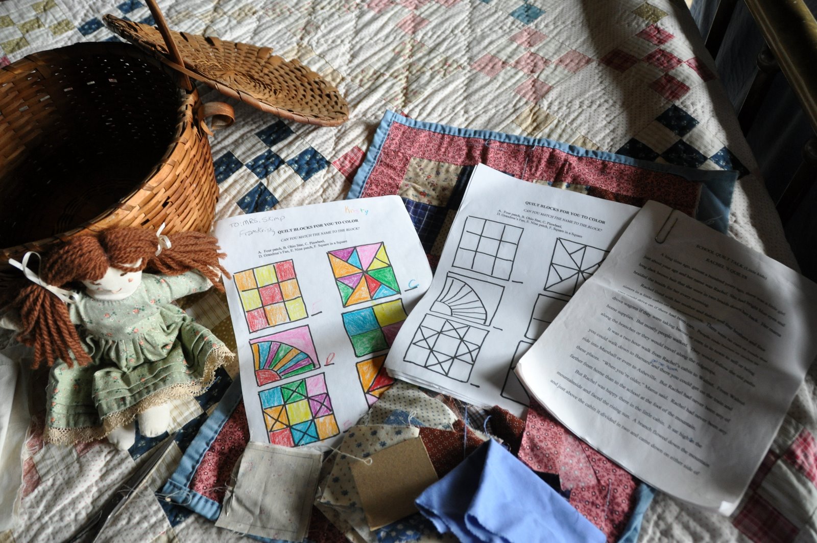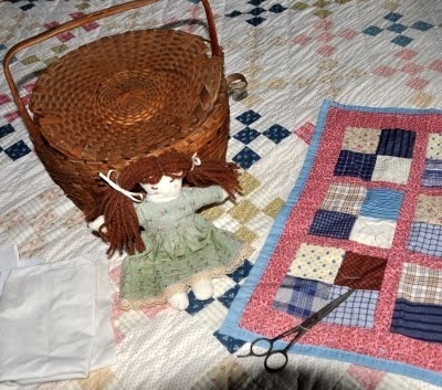 And I'd show them Rachel's doll and the quilt Rachel made with scraps from her mother and sister's sewing (left unfinished on one edge to show its construction.) By the way, those are my grandmother's sewing scissors in the picture.