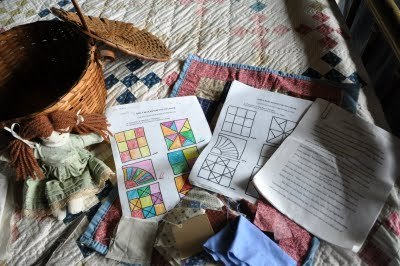 I'd bring in a bunch of quilts and talk about them and ask the kids about quilts they might have at home. I'd hand out these pictures of quilt blocks for the kids to identify and color. And I'd tell them a story about Rachel, a little girl who lived in our county about a hundred years ago -- a little girl who wanted to make a quilt for her doll, Grace Greenwood.