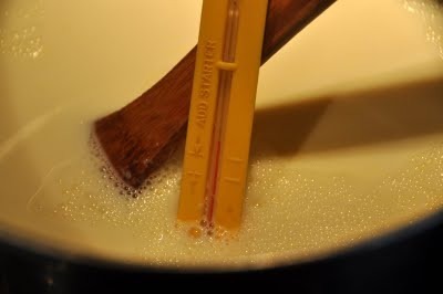 First I heat a gallon of milk (I'd skimmed off most of the cream) to 185 F and hold it at that temperature for 15 minutes, stirring frequently so it doesn't stick on the bottom of the pot.Cool to about 110 F (the specially marked yellow thermometer came with the weenie yogurt maker) then stir in starter yogurt. In the blue bowl is about a cup of store-bought Greek yogurt that I'm using as the starter.
