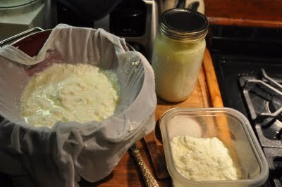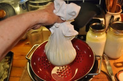 But I wanted Greek yogurt which is thicker, so I first poured off the whey that had risen to the tops of the jars then lined a colander with a clean white handkerchief and dumped in the drained yogurt to let even more whey escape. (I saved the whey to moisten the dogs' kibble -- the dogs call this a good idea.)